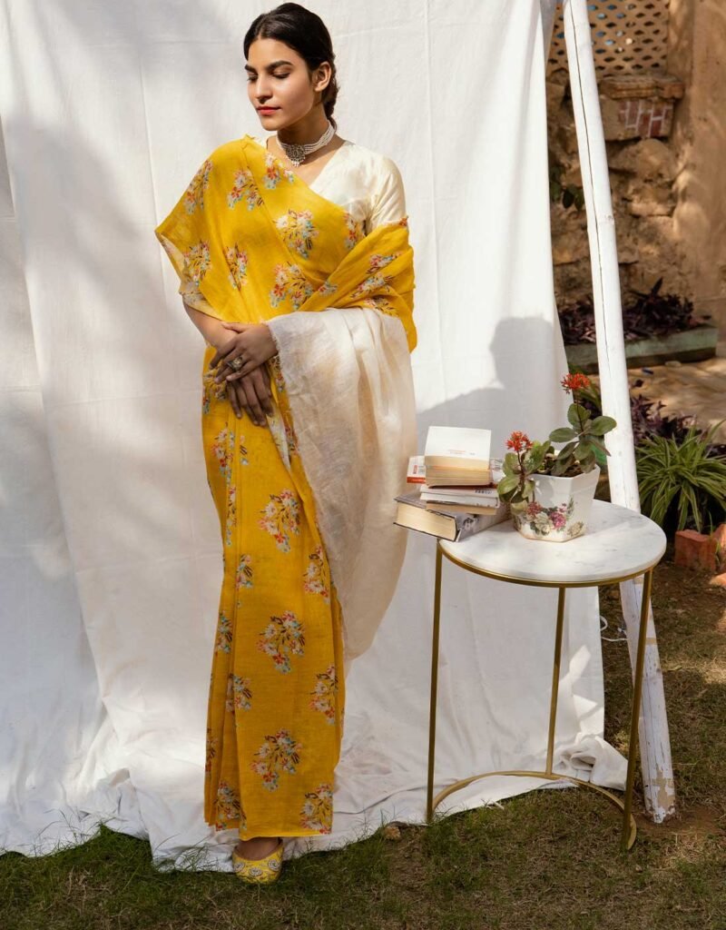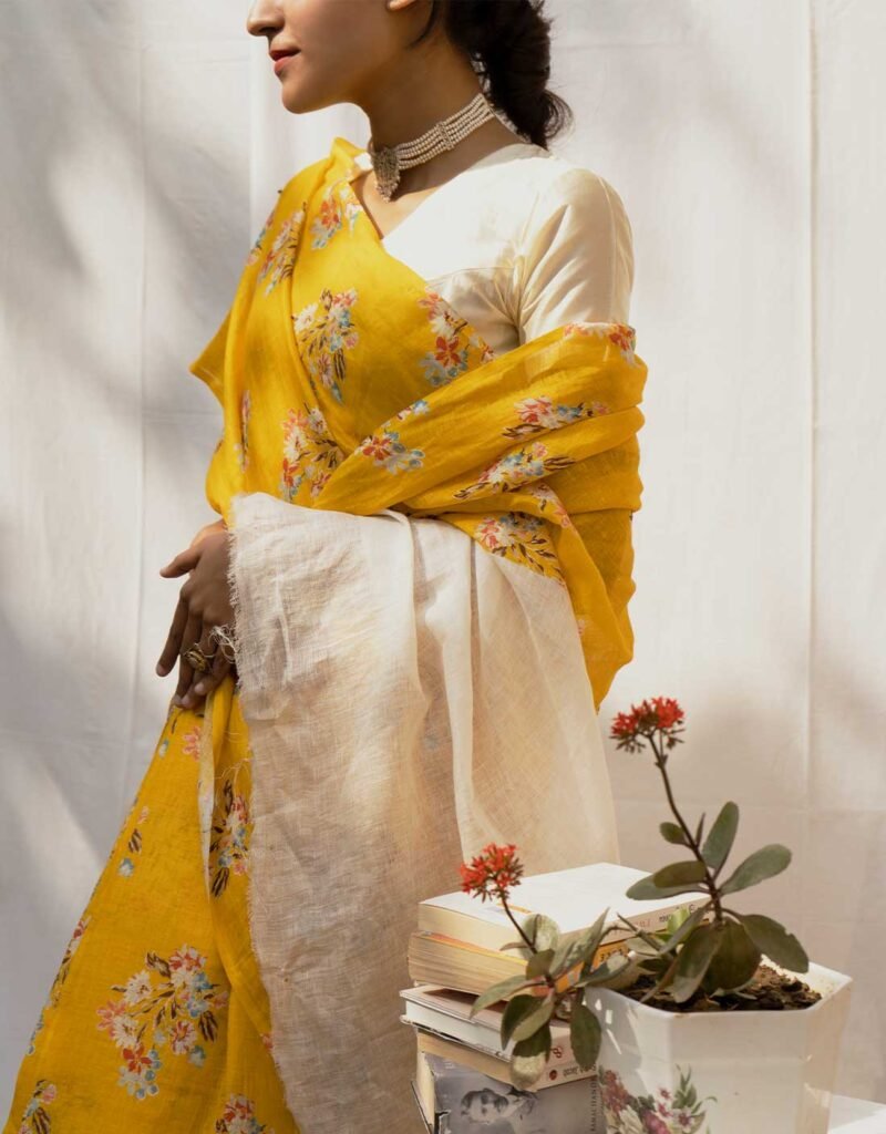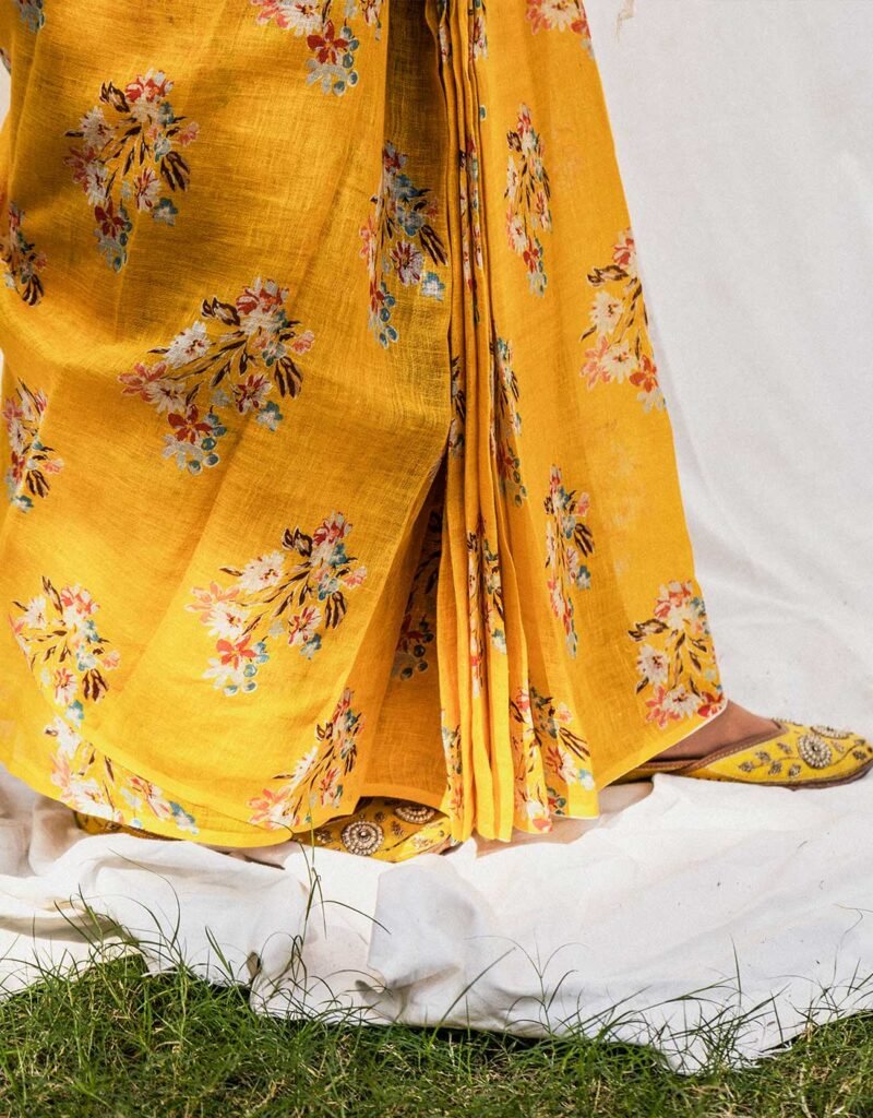 This Golden Meadow Yellow Pure Linen Saree is a vibrant blend of artistry and tradition. Handprinted and handwoven by skilled artisans, it features delicate floral motifs on a soft, breathable linen base. Its lightweight drape and lively yellow hue make it perfect for festive occasions, daytime events, or adding a touch of effortless elegance to your everyday style.