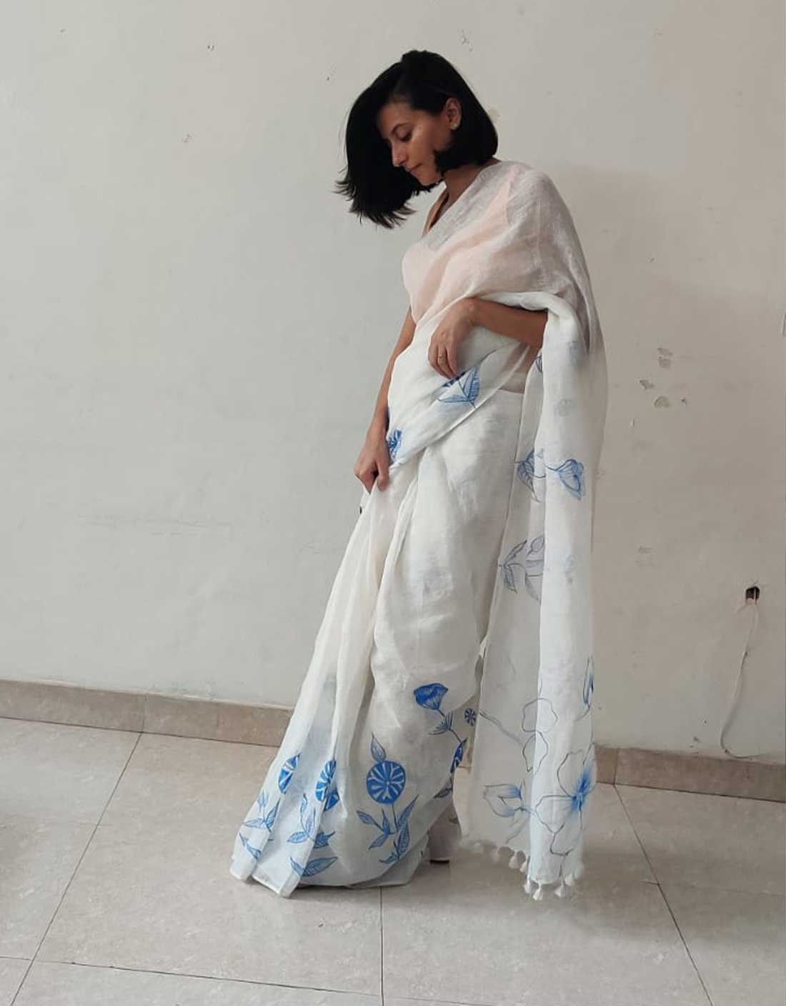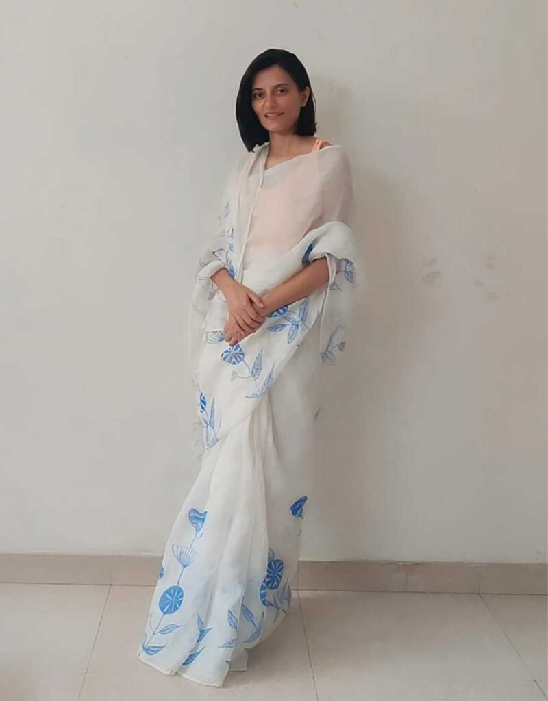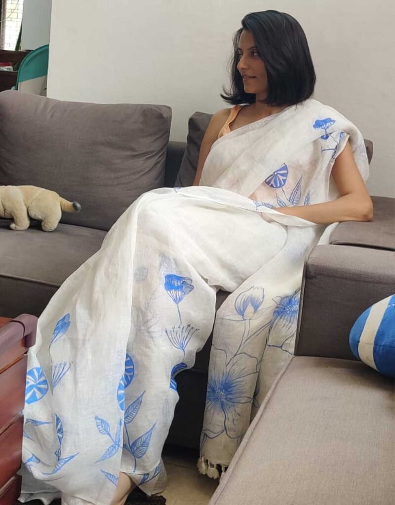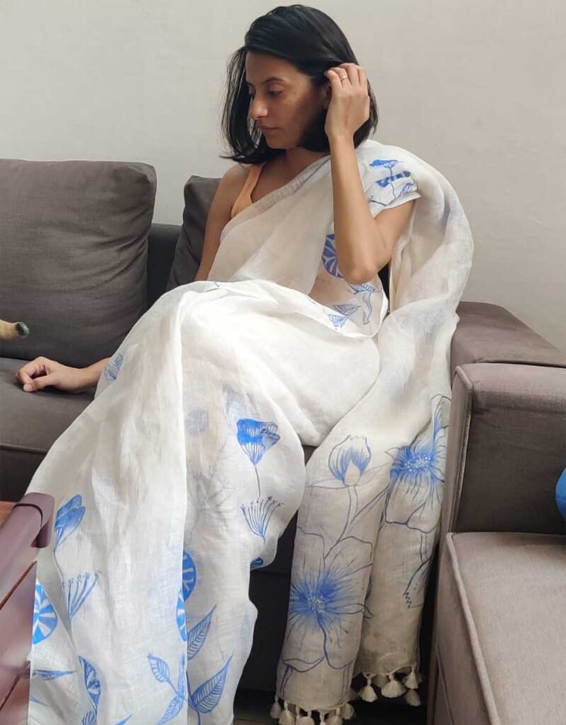 Elegant and timeless, the Handpainted Daffodil White Pure Linen Saree features delicate blue floral motifs handprinted by skilled artisans. Expertly handwoven and handprinted, this saree offers a soft, airy drape with a serene white base that highlights the intricate artwork. Perfect for minimalist styling, daytime gatherings, or anyone who loves understated beauty crafted with soulful artistry.