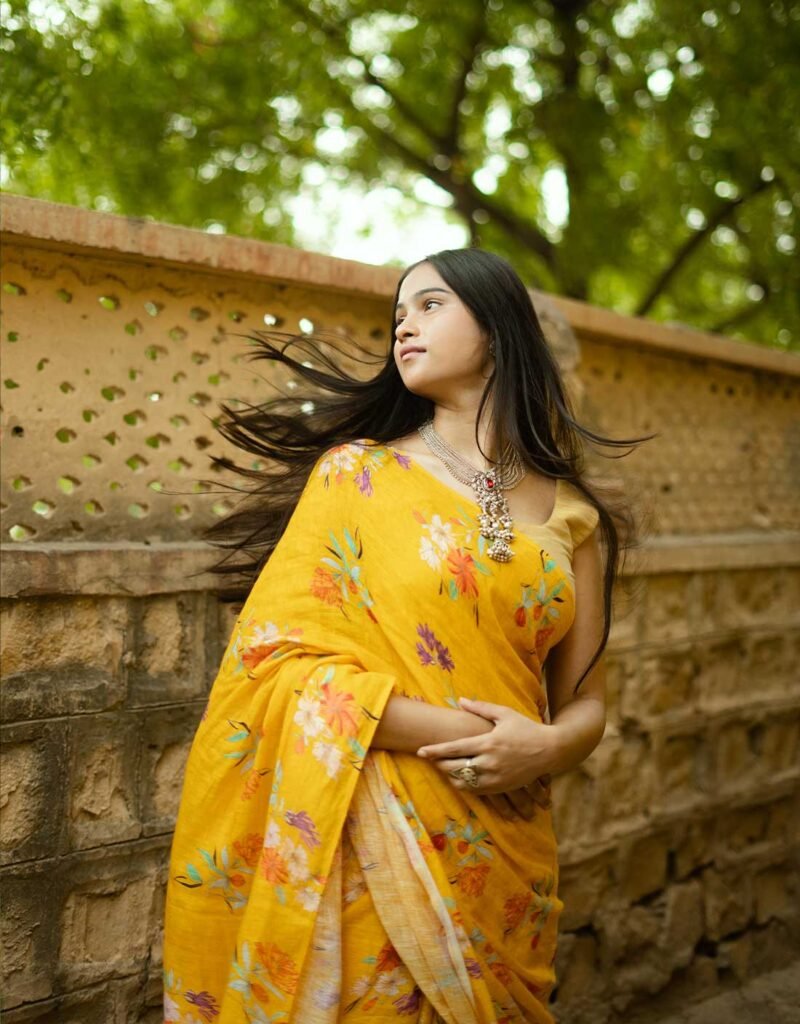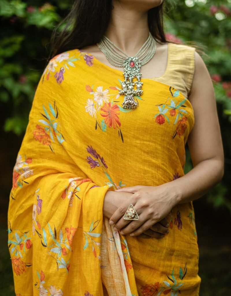 Bright, joyful, and full of charm — the Mango Delight Pure Linen Saree features vibrant handprinted floral motifs on a rich mango-yellow base. Expertly handwoven and handprinted by skilled artisans, this saree drapes effortlessly with a soft, breathable feel ideal for festive occasions, daytime celebrations, or adding a burst of sunshine to everyday elegance. Its lively color and artisanal details make it a standout piece for lovers of bold yet graceful Indian wear.