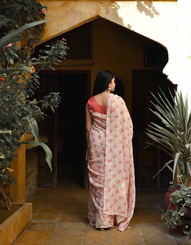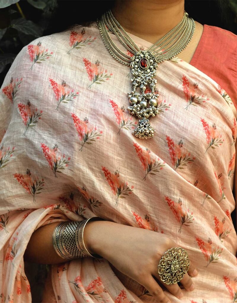 Soft, elegant, and beautifully feminine — the Peach Blossom Pure Linen Saree features delicate handprinted floral motifs scattered across a soothing peach-toned base. Expertly handwoven and handprinted by skilled artisans, it offers a light, airy drape perfect for daytime gatherings, festive occasions, or elevating everyday style with a gentle, graceful charm. A timeless piece for those who love subtle florals and pastel elegance.
