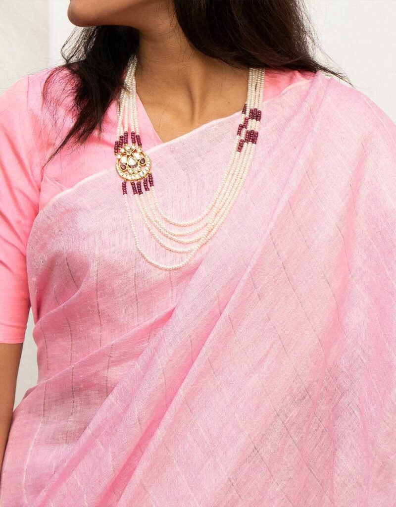 Graceful and refreshing, the Pink Ombre Zari Pure Linen Saree features a soft blend of pastel pink tones enriched with subtle zari detailing for an elegant sheen. Expertly handwoven and handprinted, this saree offers a light, comfortable drape perfect for daytime gatherings, festive occasions, or elevating everyday wear with a touch of delicate charm. Its soothing color palette and artisanal craftsmanship make it a timeless wardrobe essential.