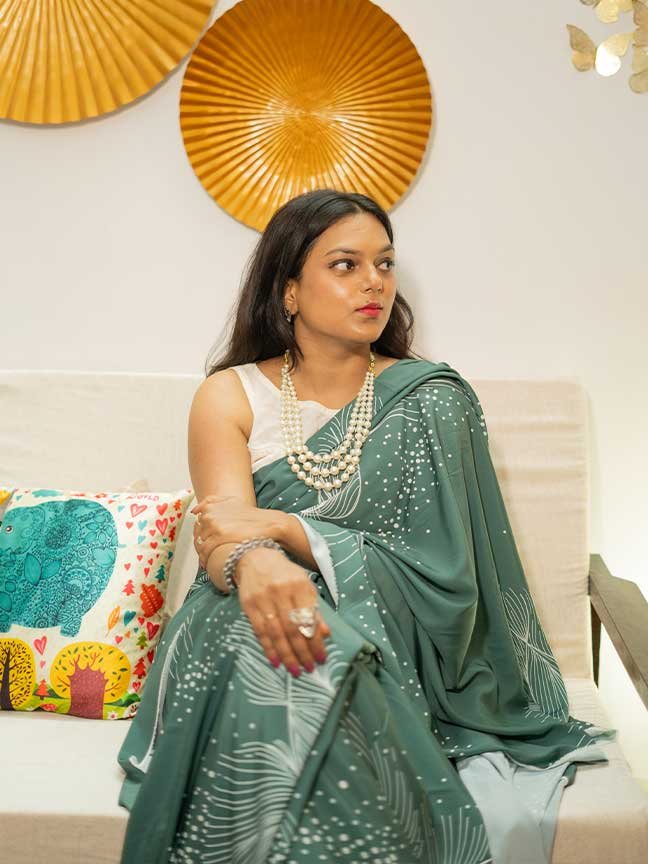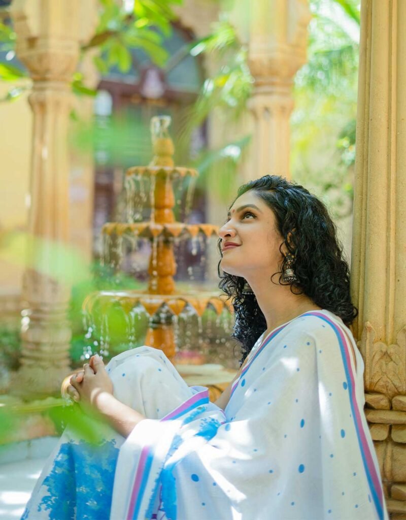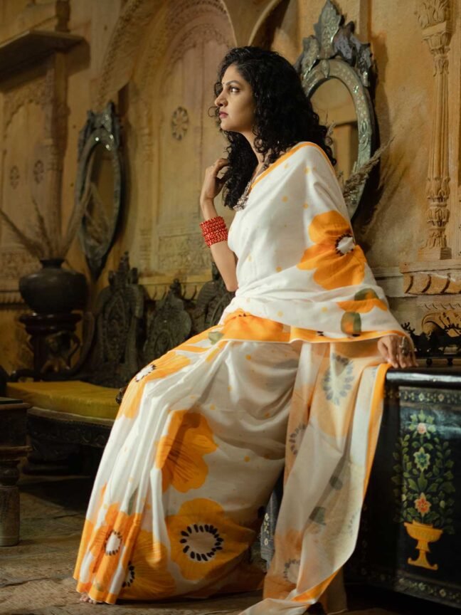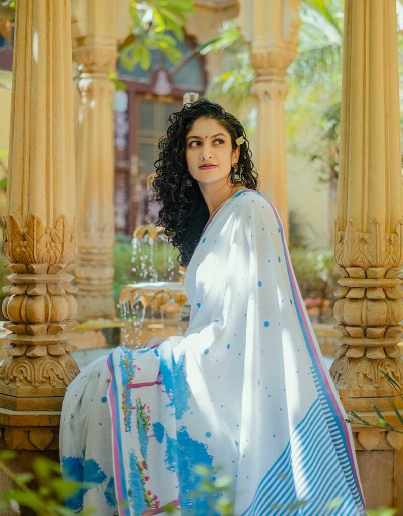 Artistic, refreshing, and beautifully modern — the Tree of Life Pure Linen Saree features expressive handprinted splash patterns in vibrant shades of blue, complemented by soft striped detailing along the border. Expertly handwoven and handprinted, this saree drapes effortlessly with a lightweight feel, making it perfect for daytime outings, cultural events, or adding a contemporary art-inspired touch to your wardrobe. A striking fusion of tradition and creativity crafted by skilled artisans.