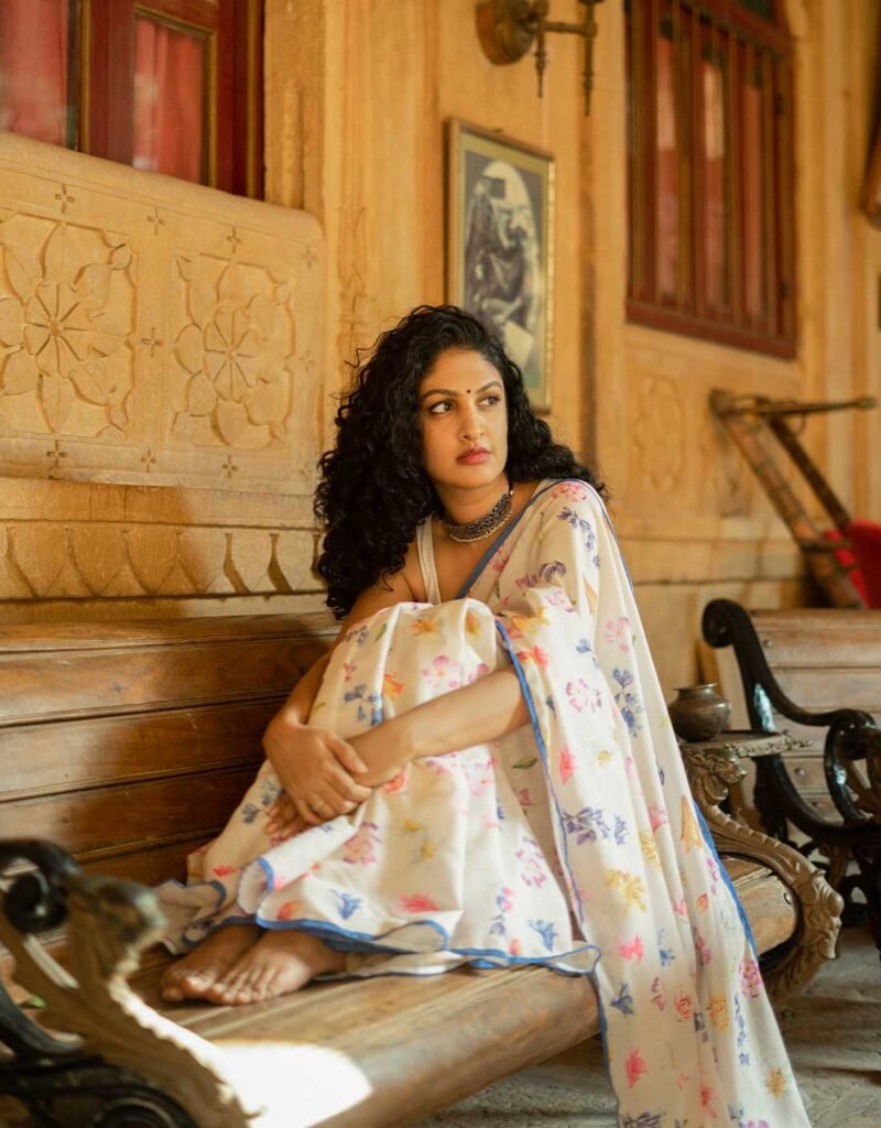 Soft, airy, and full of lively charm — the Tropical Twist Pure Linen Saree features delicate handprinted floral motifs in vibrant tropical shades scattered across a serene ivory base. Expertly handwoven and handprinted, this saree offers an effortlessly light drape, making it perfect for daytime outings, festive brunches, or adding a playful yet elegant touch to your everyday wardrobe. A beautiful blend of subtle sophistication and joyful color.