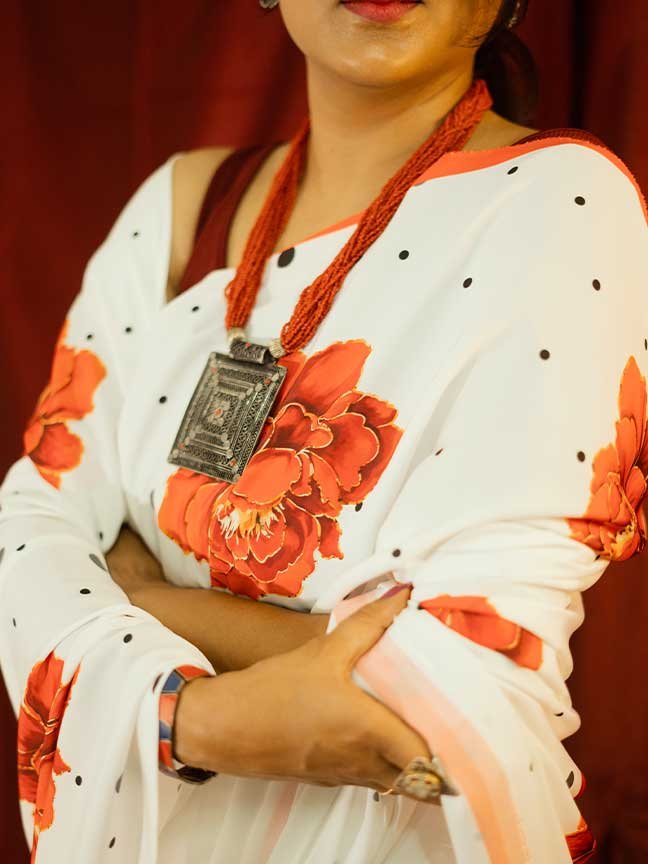 Classic with a bold floral statement, the White & Rust Rose Crepe Saree features striking handprinted rose motifs in rich rust tones set against a pristine white base. Crafted in soft, flowy crepe, this saree drapes gracefully while offering all-day comfort. Handprinted and handwoven by skilled artisans, it blends timeless elegance with contemporary charm, making it ideal for festive occasions, evening gatherings, or elegant statement wear.